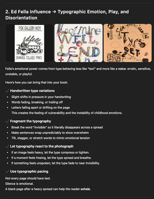 This week, I didn’t use AI much to assist me with visual development. However, I used ChatGPT to assist me with coming up with ideas on how to make the pages of my book feel cohesive.